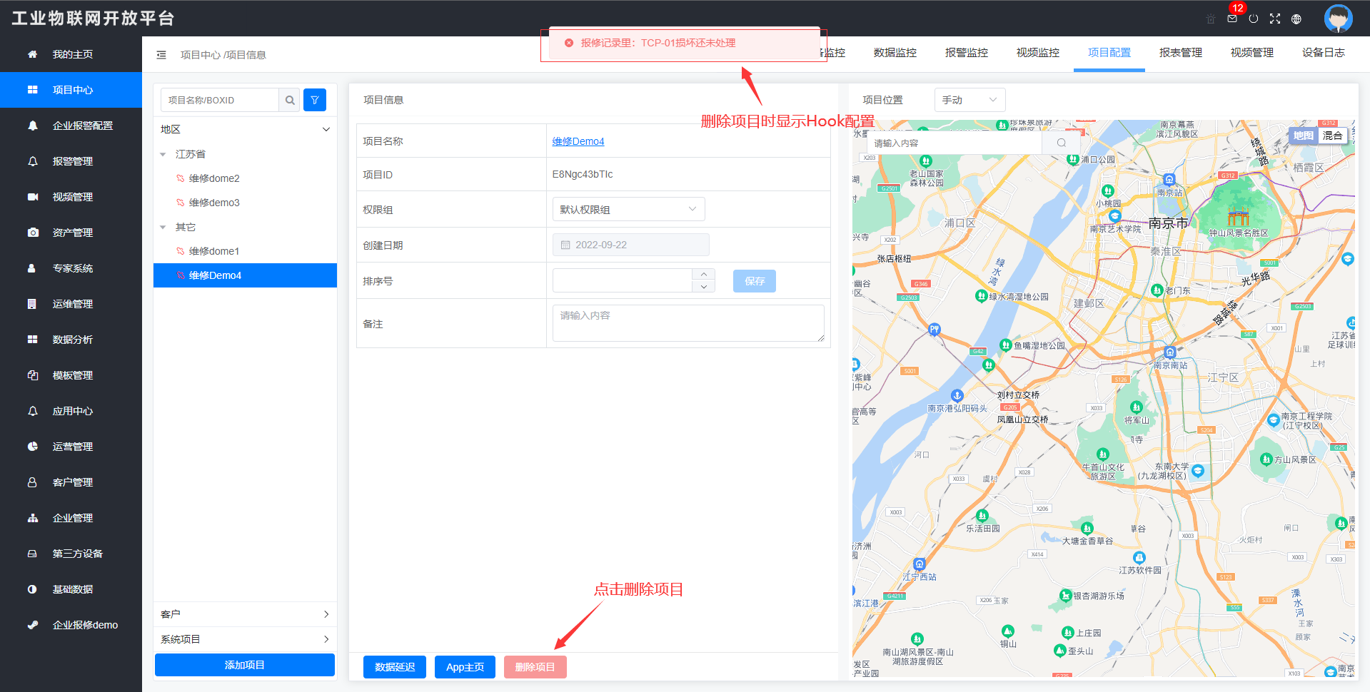 此节将带领开发者使用WebHook来拦截业务平台事件,实现了以下场景: 当删除业务平台的项目时,如果该项目还存在未处理的报修记录,那么将拦截此事件,并在删除项目时提示该项目存在【报修内容】未处理。