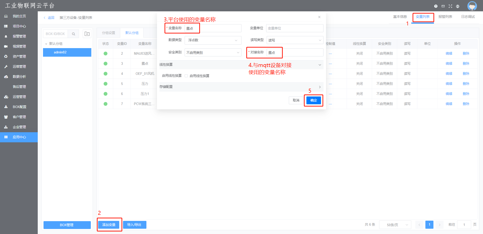 【第三方设备】-点击设备-【变量列表】-添加变量,弹出【添加变量】页面