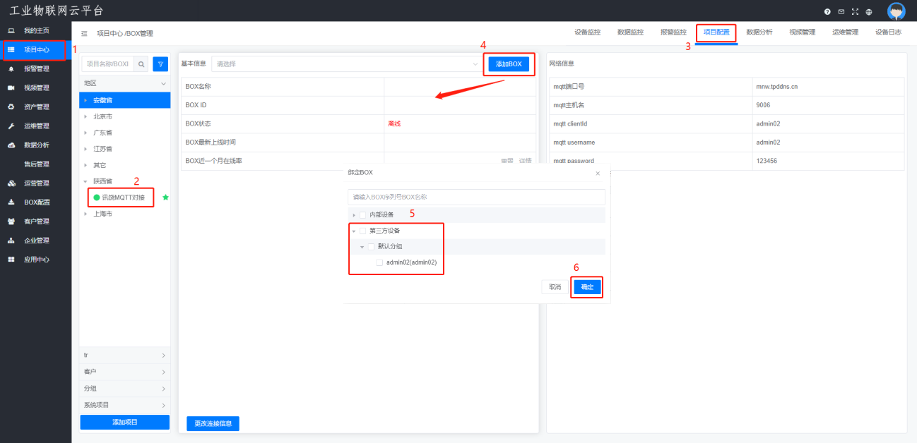进入【项目中心】——选择项目——【项目配置】,点击“添加BOX”弹出【绑定BOX】的页面,此页面出现的设备均为没有被其他项目绑定过;选择相应设备后点击“保存”。