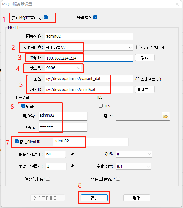 其中 mqtt 主机名,mqtt端口号,mqtt clientId,mqtt username,mqtt password 要填入MQTT配置中;