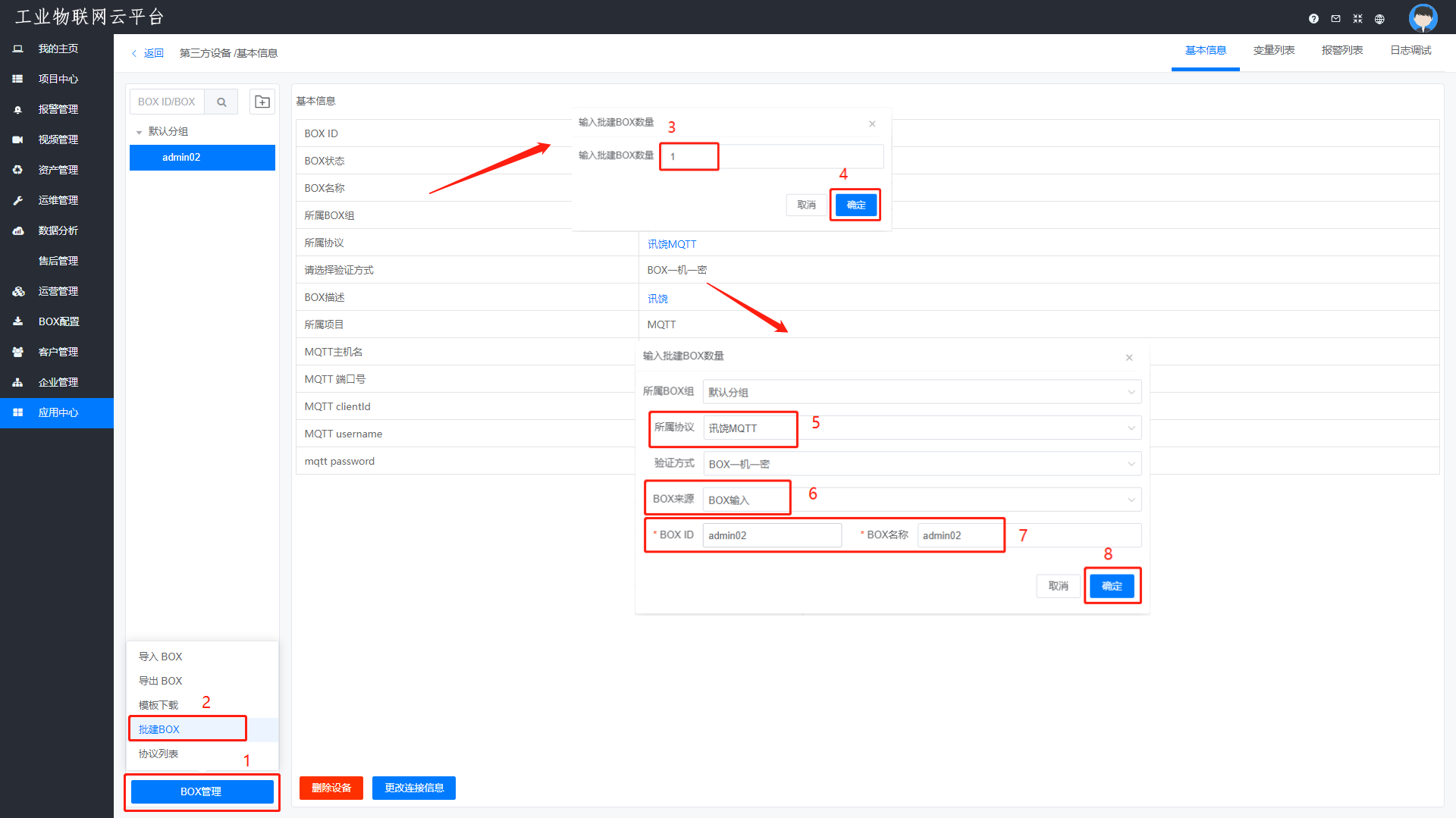 点击【应用中心】—>第三方设备—>BOX管理—>批建设备—>输入批建设备数量(这里1台为例)