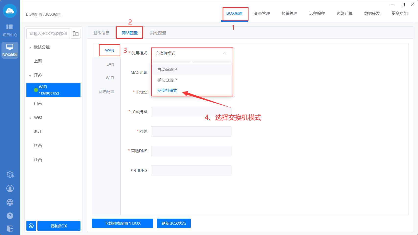 主要用于盒子4G或者wifi方式上网,两个网口都和PLC等设置通讯。