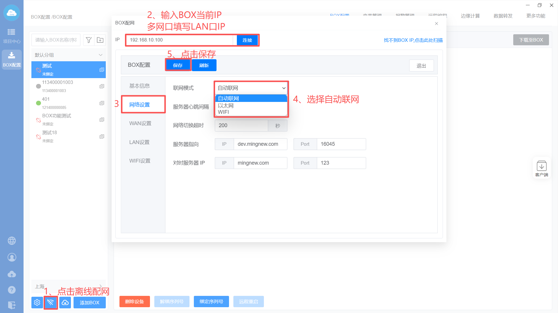(1)网络配置,设置联网模式:自动联网