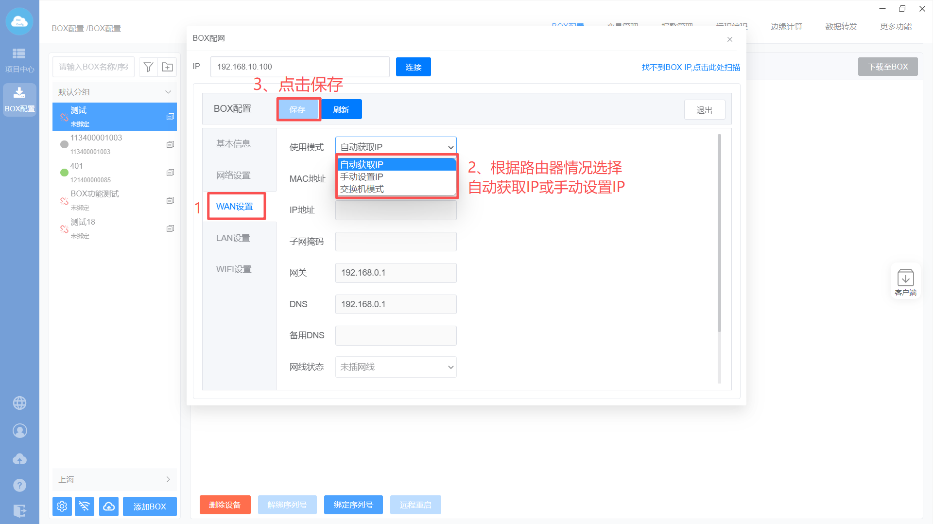 2、在弹出的页面输入BOX IP地址,点击“连接”,输入账户密码后进入BOX配置页面。