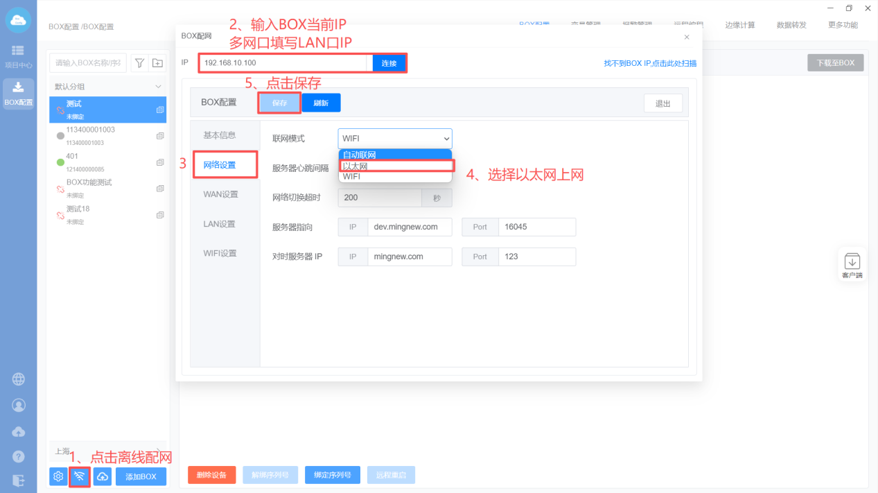 - 电脑与BOX网线直连(多网口直连LAN口),电脑网卡IP需要设置和BOX IP同一网段;