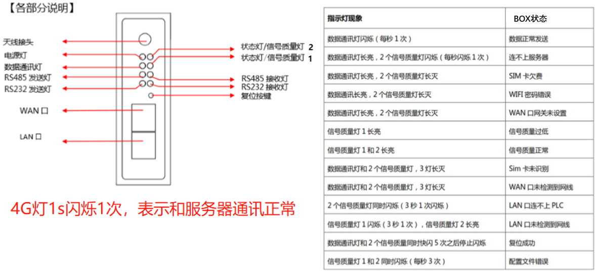 如果新外观BOX状态显示离线,则需要查看BOX的指示灯状态,如下表: