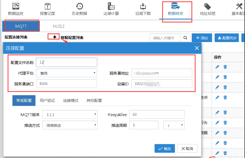 进入【数据转发】-MQTT,点击【配置连接列表】后面的“+”图标,弹出【连接配置】页面,其中