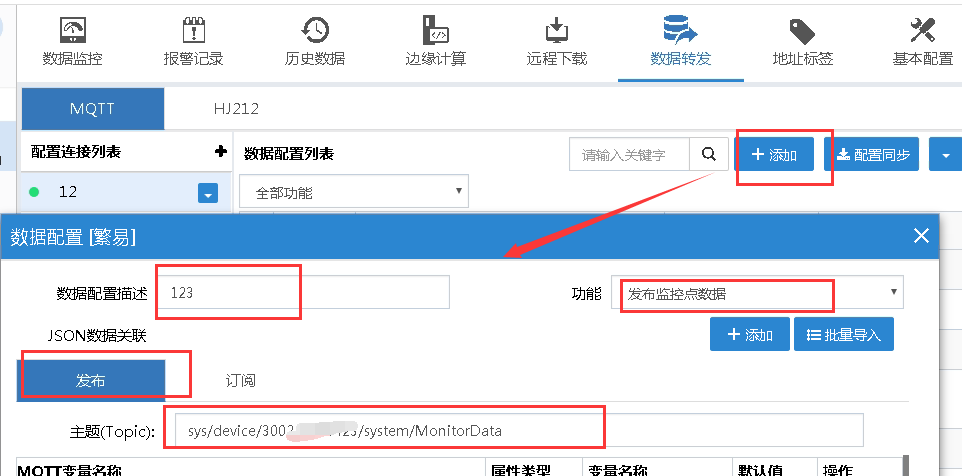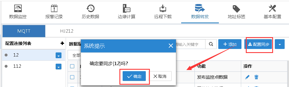 添加好后 点击“配置同步”,跳出系统提示窗口,点击“确定”后会下发MQTT配置。