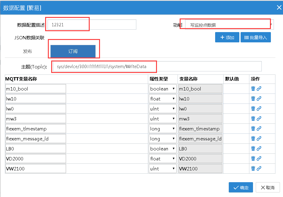 数据类型:布尔/整数/长整数/浮点数,与MQTT设备变量设置保持一致