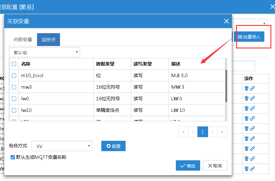 对接名称: MQTT设备变量名称,默认与变量名称一致,可修改;
