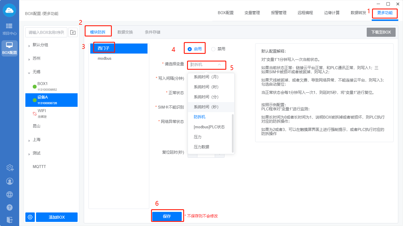 当与PLC通讯正常,与云端通讯正常,会间隔1分钟对防拆变量写入一次1;