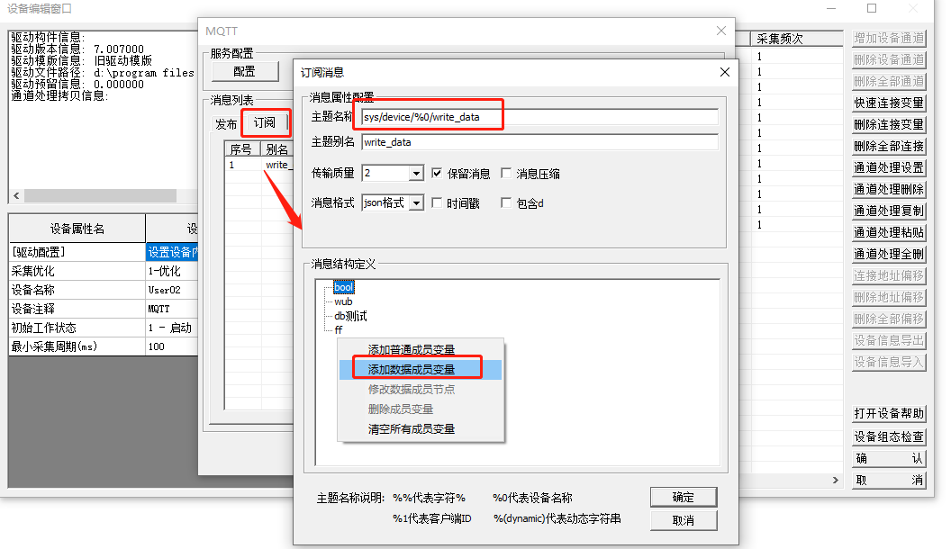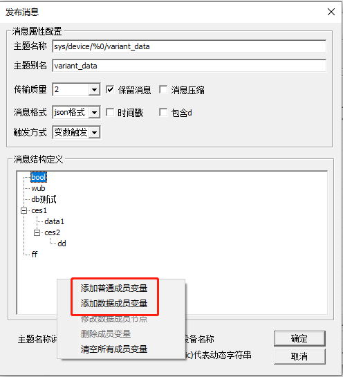 右键点击“消息结构定义”框,可添加普通成员变量和数据成员变量,设置成树状分类变量,方便管理。