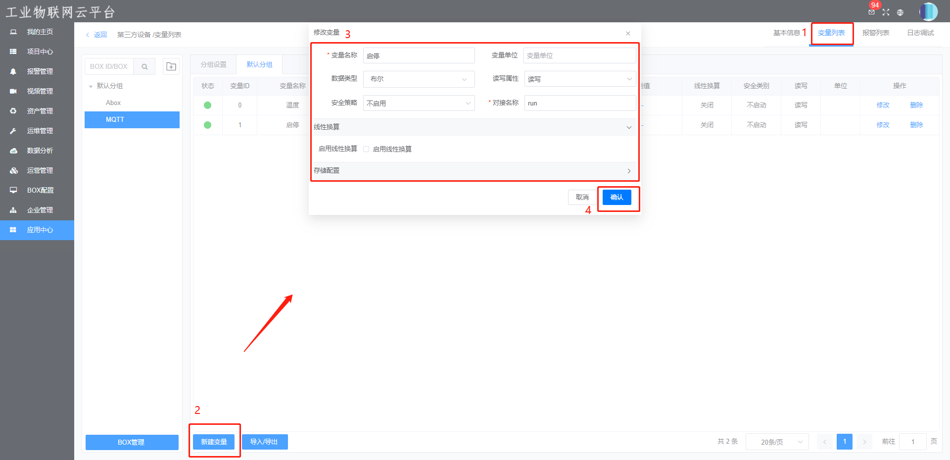 【第三方BOX接入】-点击设备-【变量列表】-新建变量,弹出【新建变量】页面