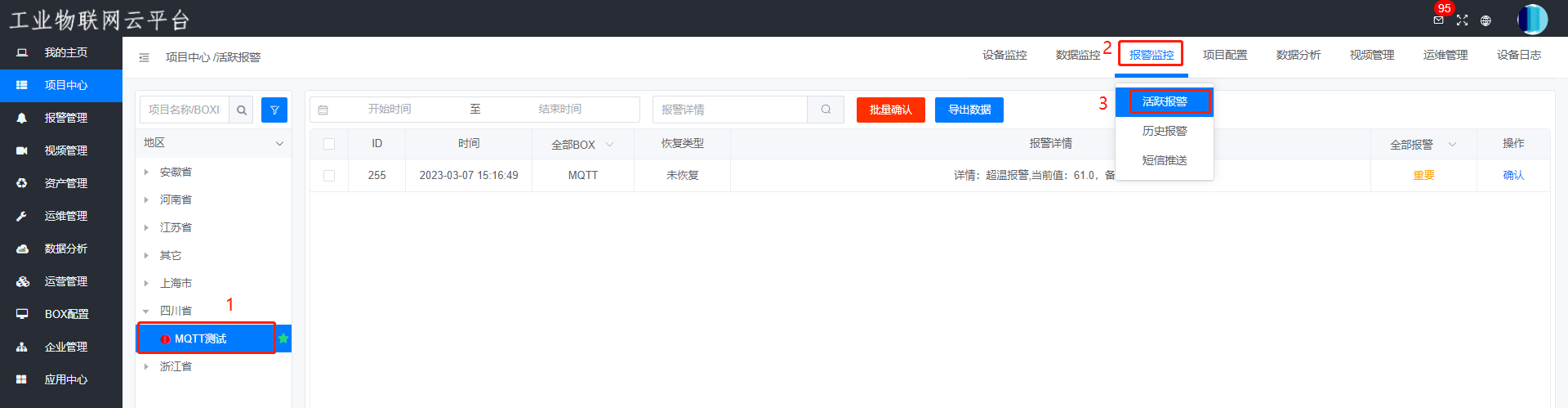当报警触发后,在【项目中心】——【报警监控】——【活跃报警】里可以看到报警信息