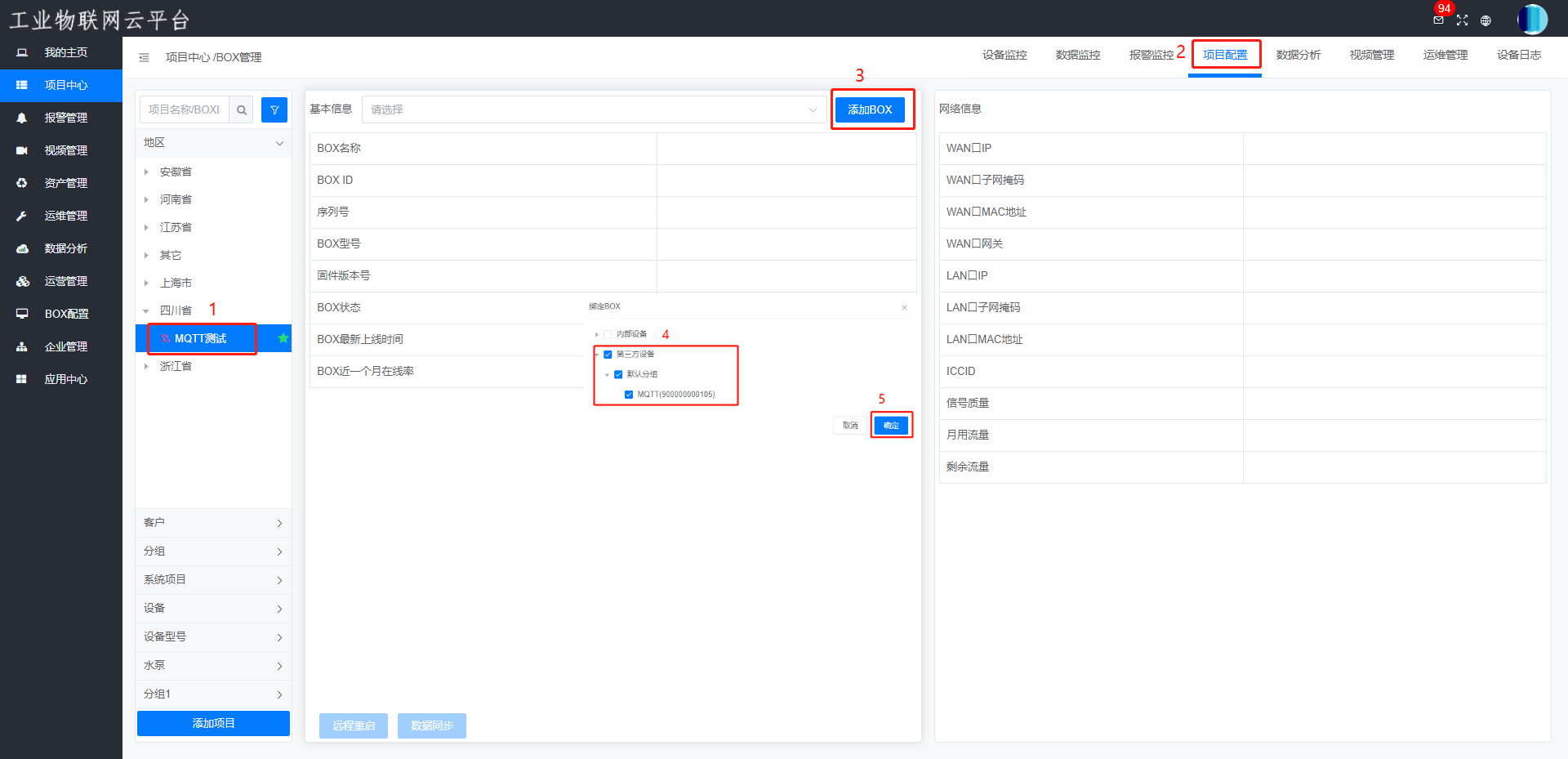 进入进入【项目中心】——选择项目——【项目配置】,点击“绑定设备”弹出【添加设备】的页面,此页面出现的设备均为第三方设备里添加的设备并且没有被其他项目绑定过;选择相应设备后点击“保存”。