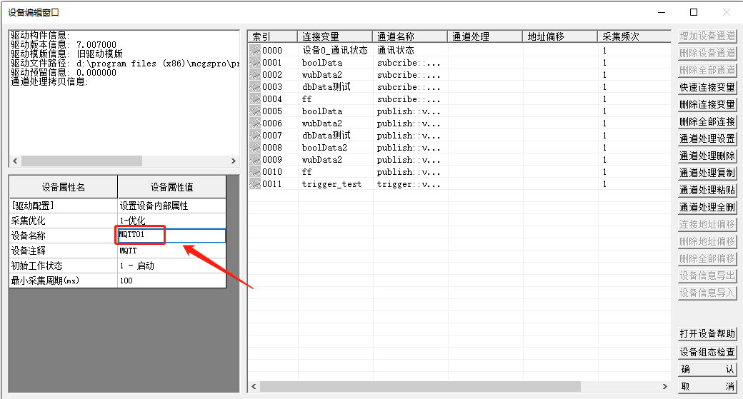 点击确认保存关闭内部属性编辑窗口,回到设备编辑窗口,即可看到添加的成员变量通道,对应关联变量连接即可(如需将现有程序中的数据发布到MQTT服务器,可直接关联其他设备中现有的变量,无需添加新变量)。