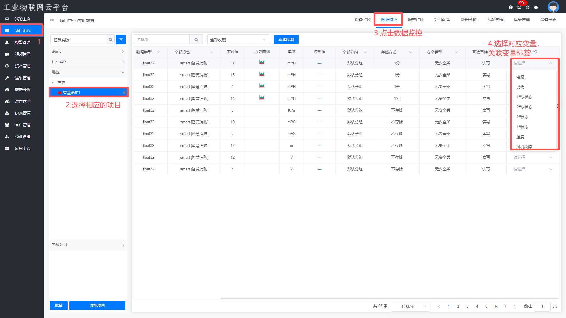 项目中心—>选择项目—>数据监控—>实时数据,关联对应的变量标签
