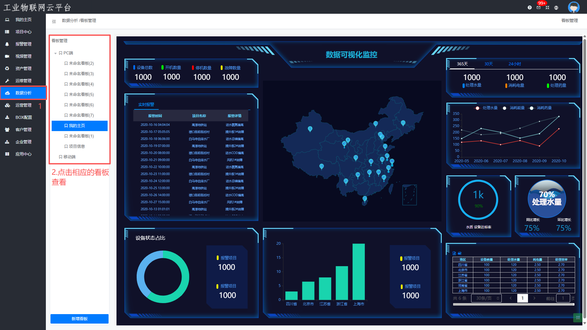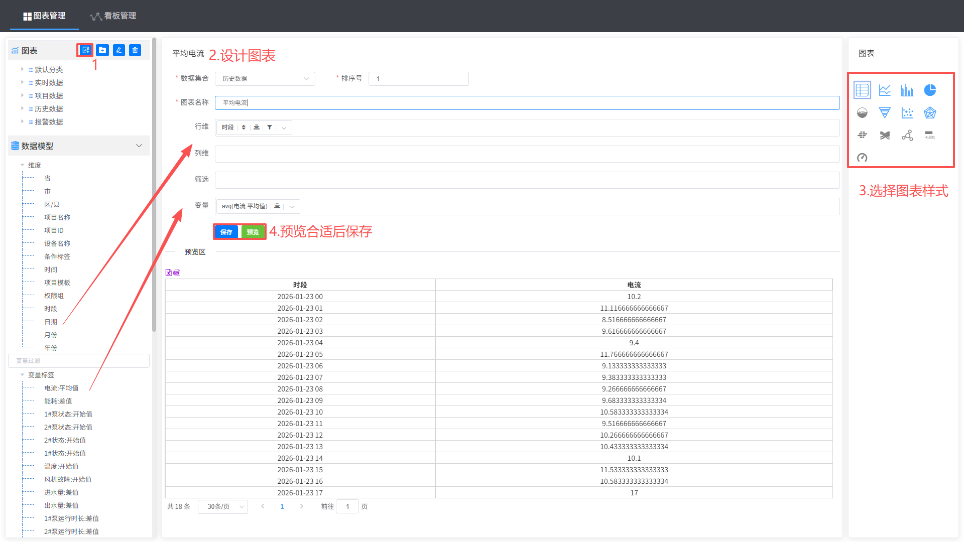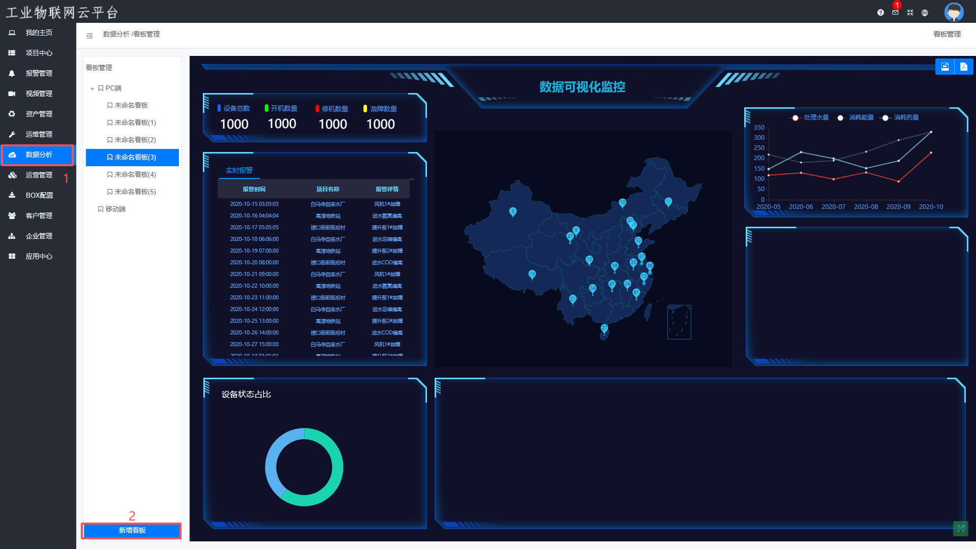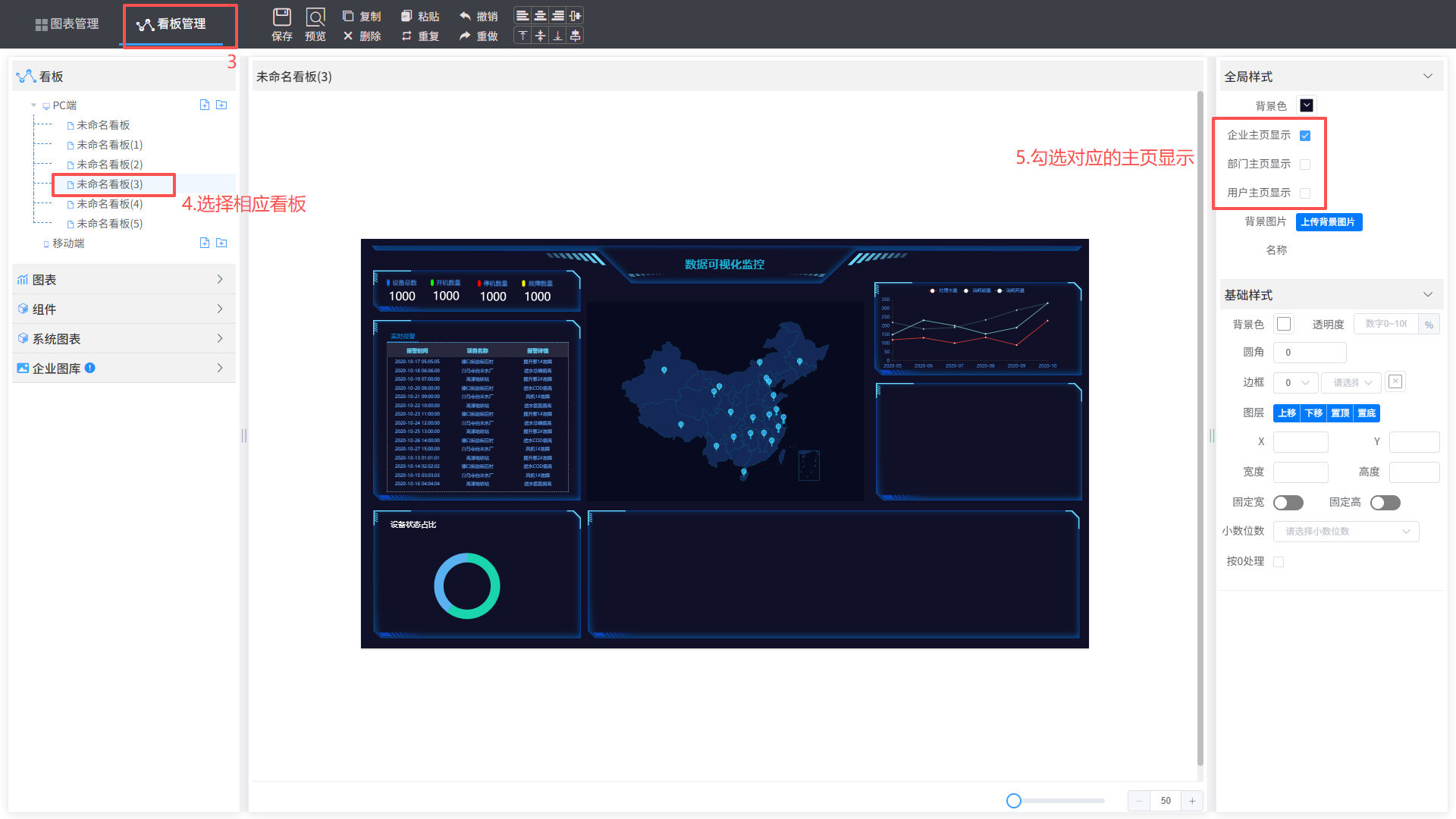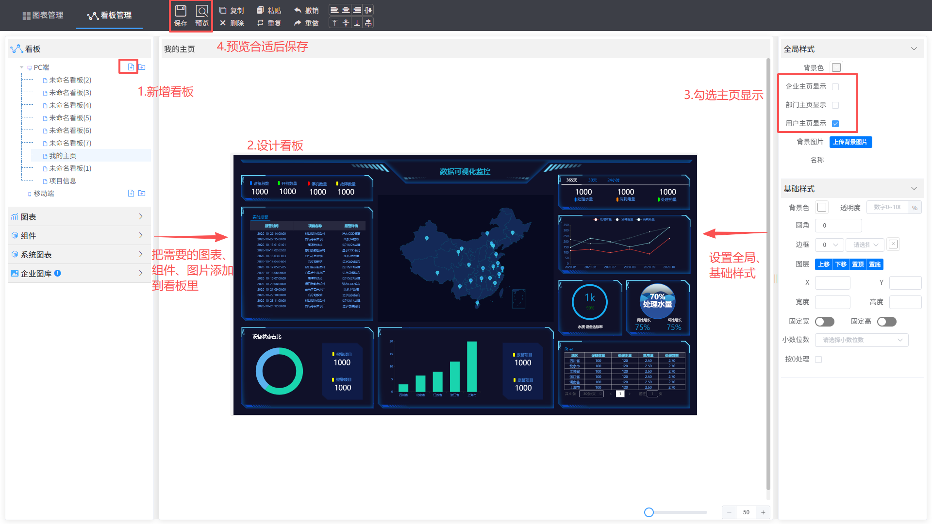 数据分析—>新增看板—>看板管理—>添加看板—>设计图表样式—>保存