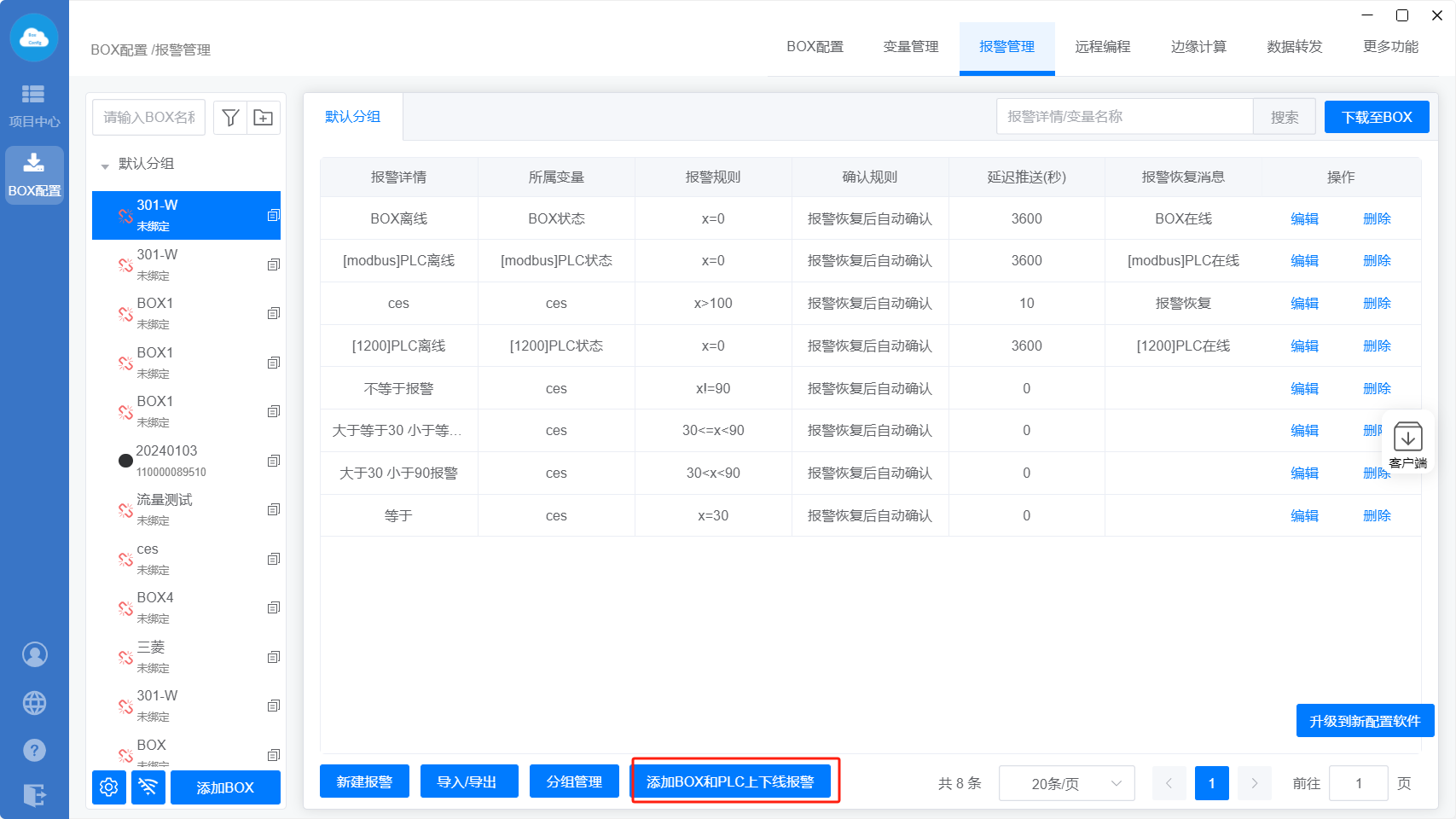 进入BOX配置——【报警管理】点击“添加BOX和PLC上下线报警”,然后“下载至BOX”