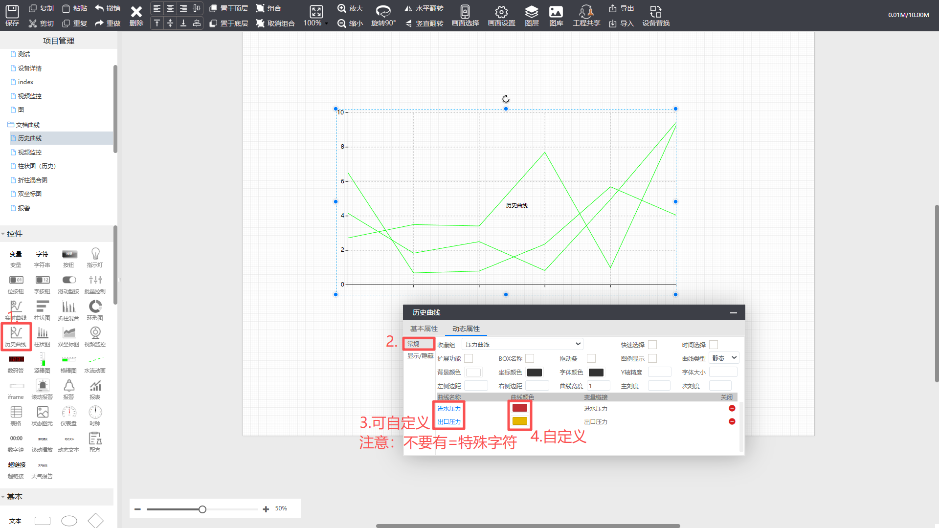 图例显示:是否显示图例,图例为曲线名称,图例颜色和曲线颜色一致;在运行态可点击图例显示隐藏曲线