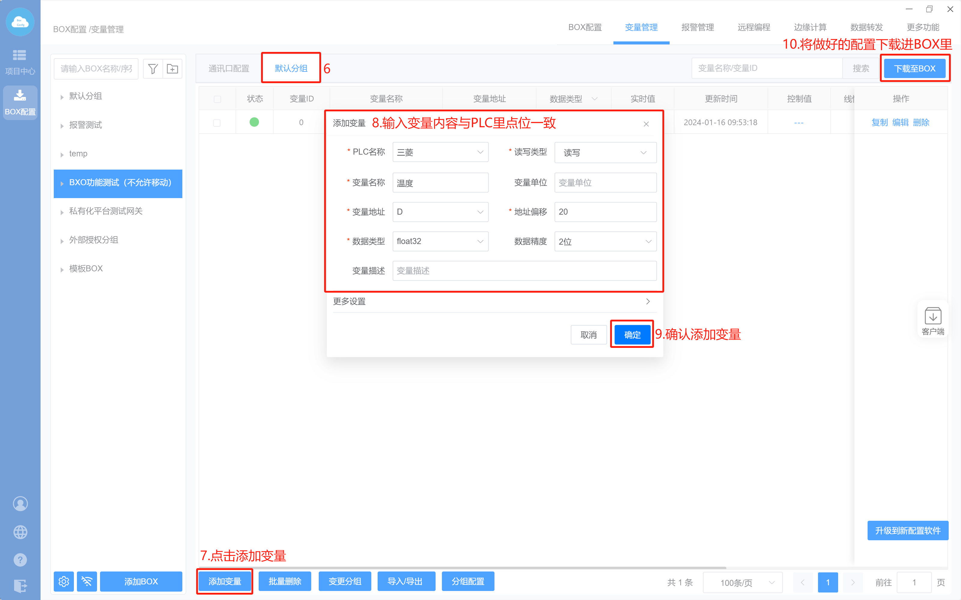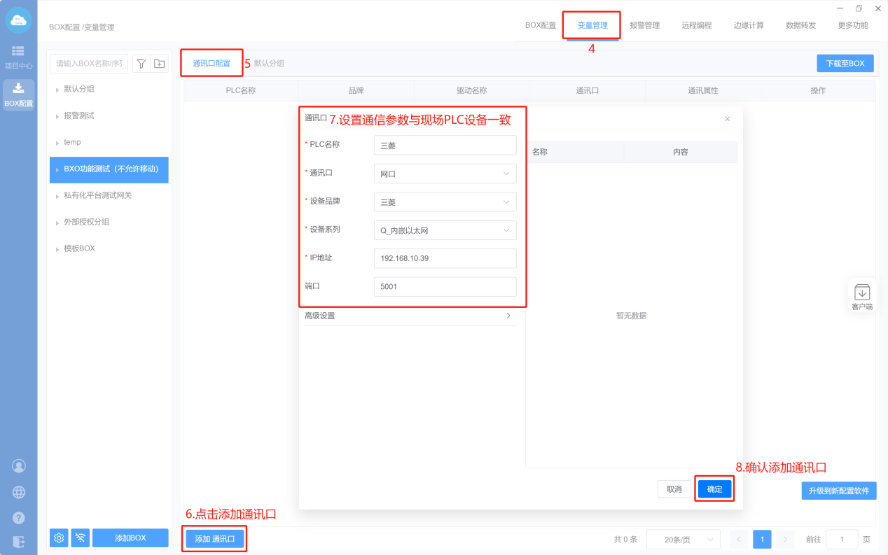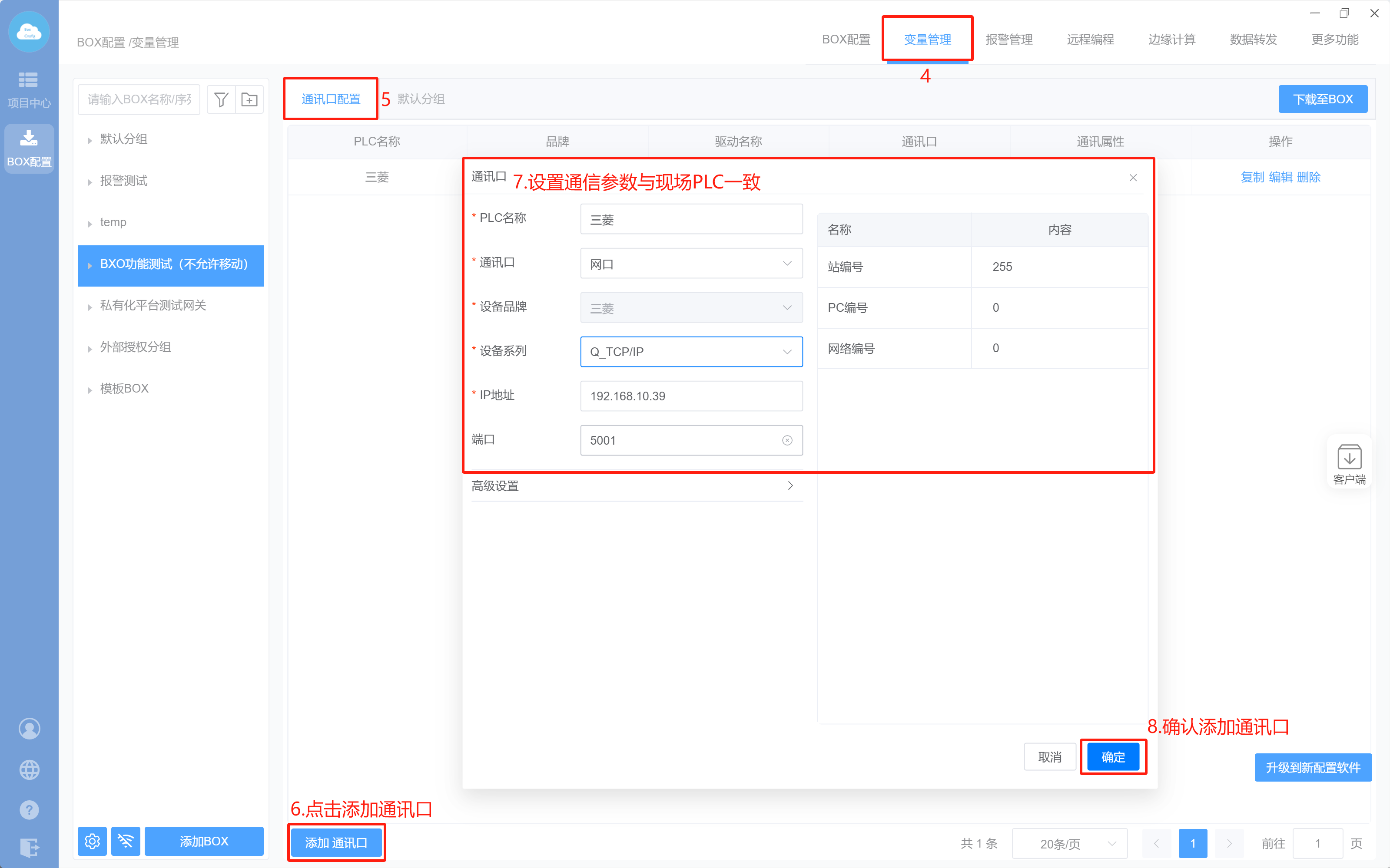 - Box设置(注意:修改box参数,与PLC保持在同一网段)