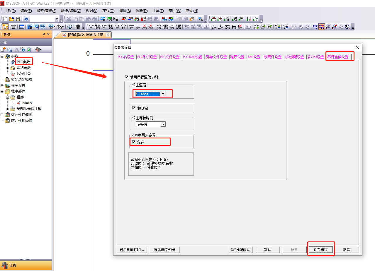设置PLC的串口参数为:M4C协议,19200,8,1,奇校验。