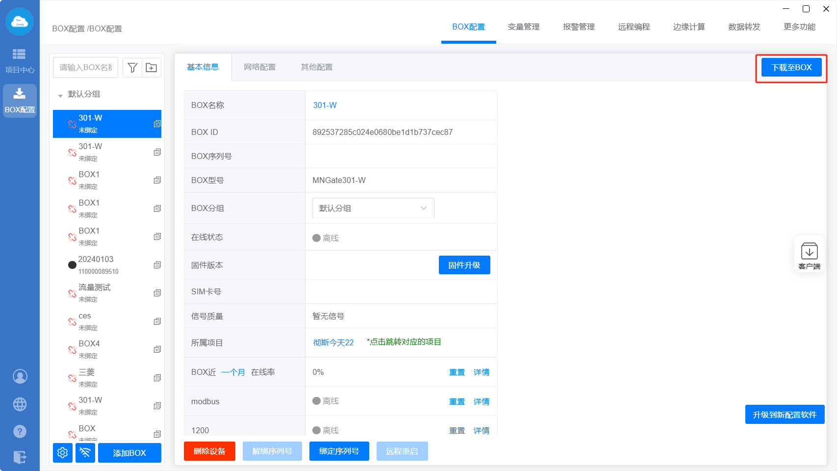 如果此按钮是蓝色,表示BOX里的配置和平台端配置不一致,需要下载到BOX一次,否则新修改的配置不生效,造成变量读取不到等问题。