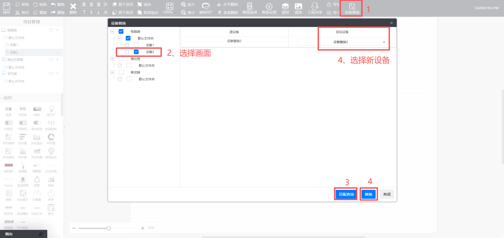 - 点击“设备替换”,选择新画面,点击“匹配查询”,再目标设备一栏选择新设备,然后点击替换