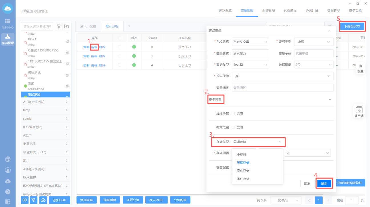 1、如果想要展示历史数据,需要先在配置工具【BOX配置】-【变量管理】中对变量配置存储,并下载到BOX;