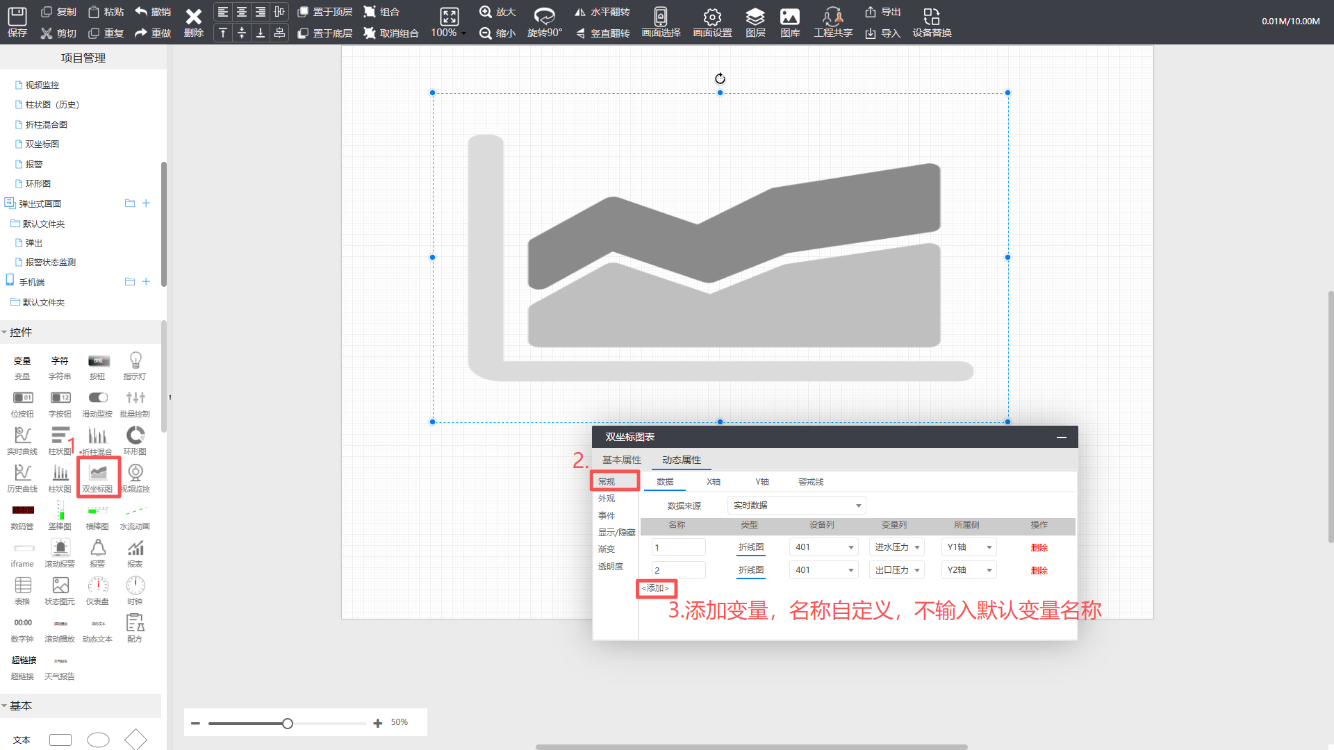 - 数据:选择数据来源,添加变量,选择图表类型,配置对应Y轴;
