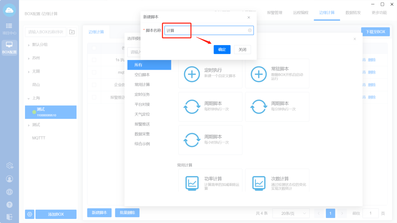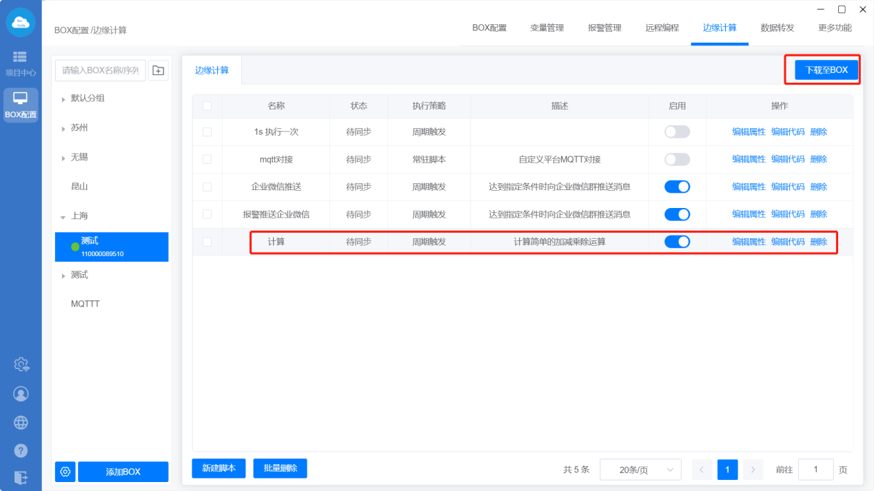 新添加的脚本显示在边缘计算列表里,状态“待同步”表示脚本还未下载到BOX里