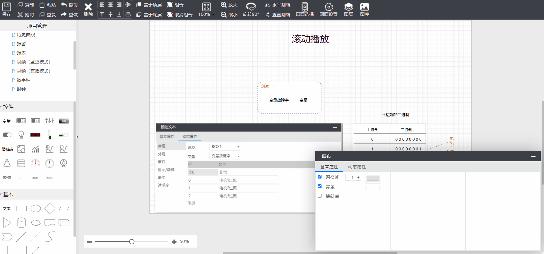如果设置的变量字的第1、2位都为1,显示“电机1过流 电机2过流”,文字滚动。