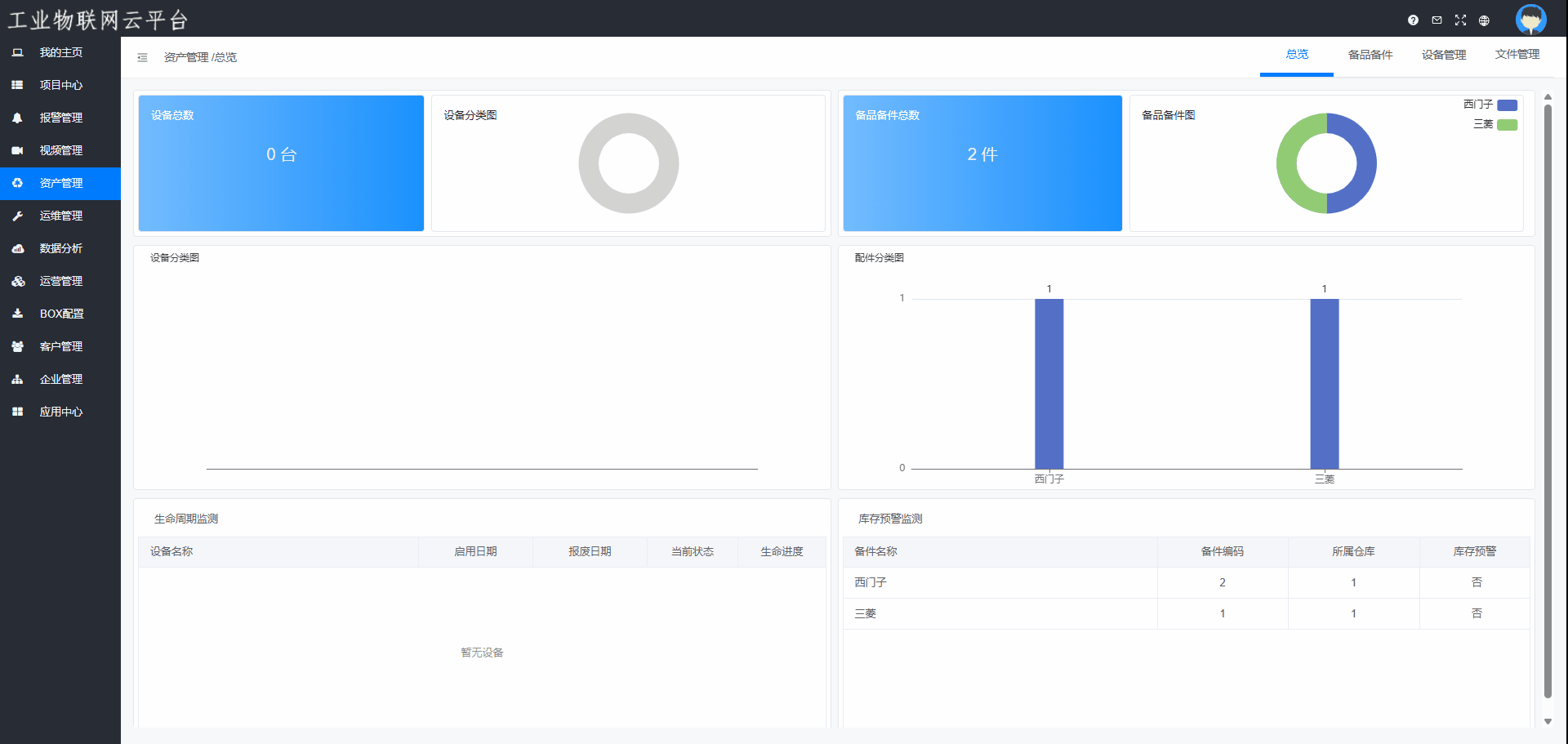 总览界面显示设备管理和备品备件的统计情况。