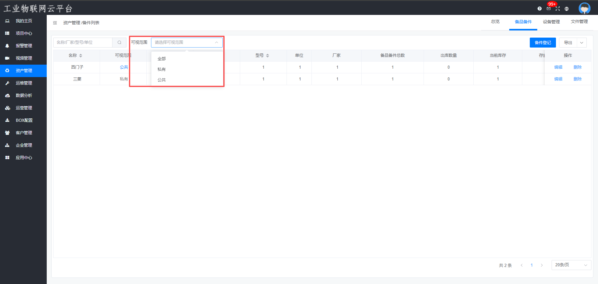 私有:通过部门隔离,仅能看到自己部门的私有备品和公共备品