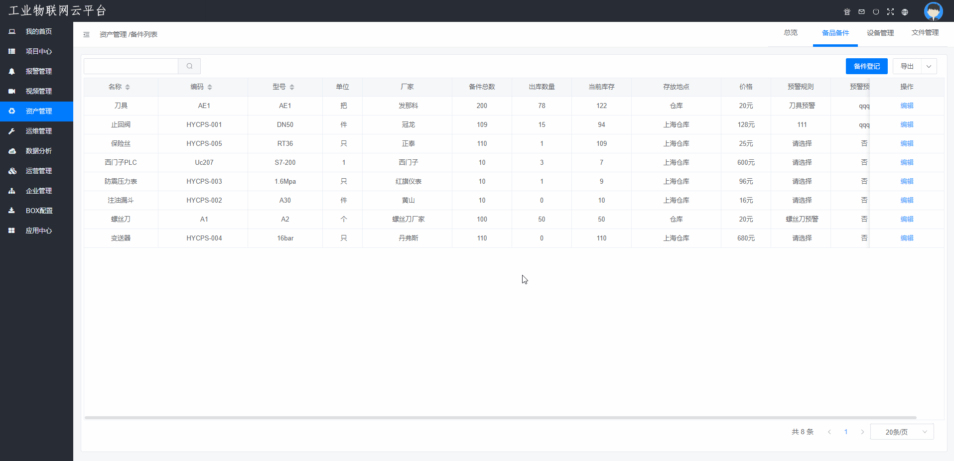 可以添加备品备件清单,对备品备件进行入库,出库的登记,并对备品备件的库存进行预警,及时提醒。