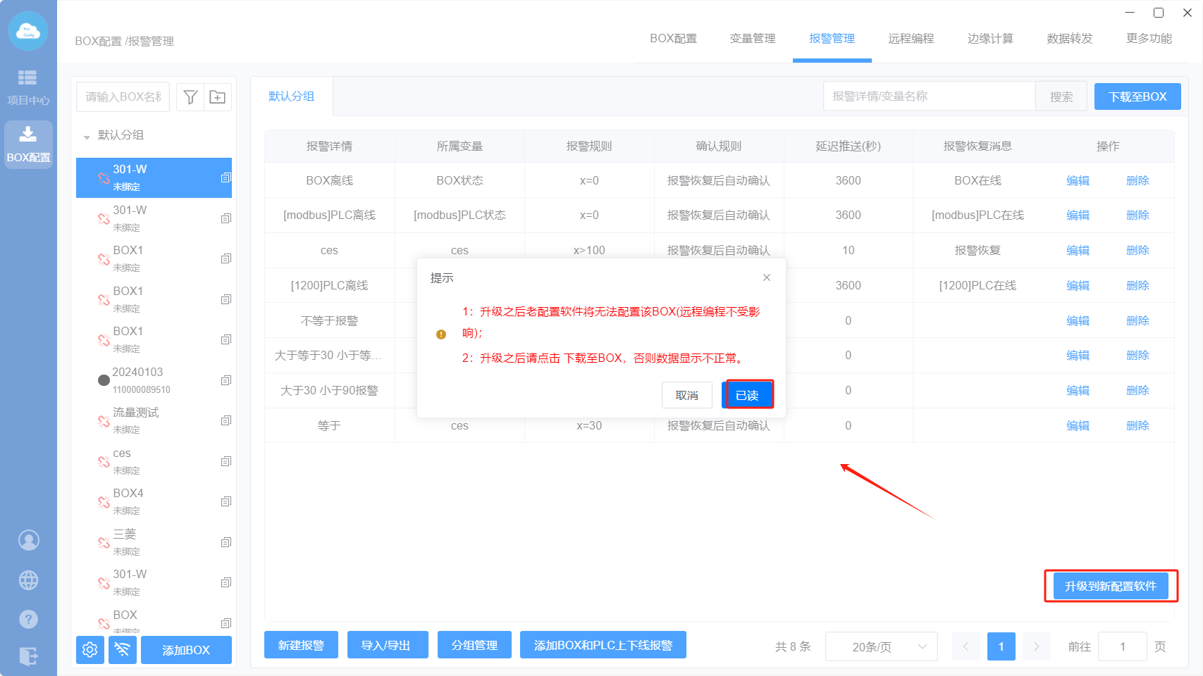 进入BOX配置或者新配置软件,点击“升级到新配置软件”,会弹出提示,点击“已读”