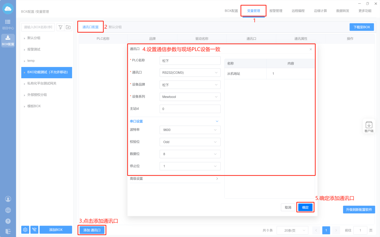 注意:系统连接只能和一个设备进行通讯,如果同时连了多个设备,需要使用连接1-5;BOX这边的端口和PLC里设置的端口保持一致就行