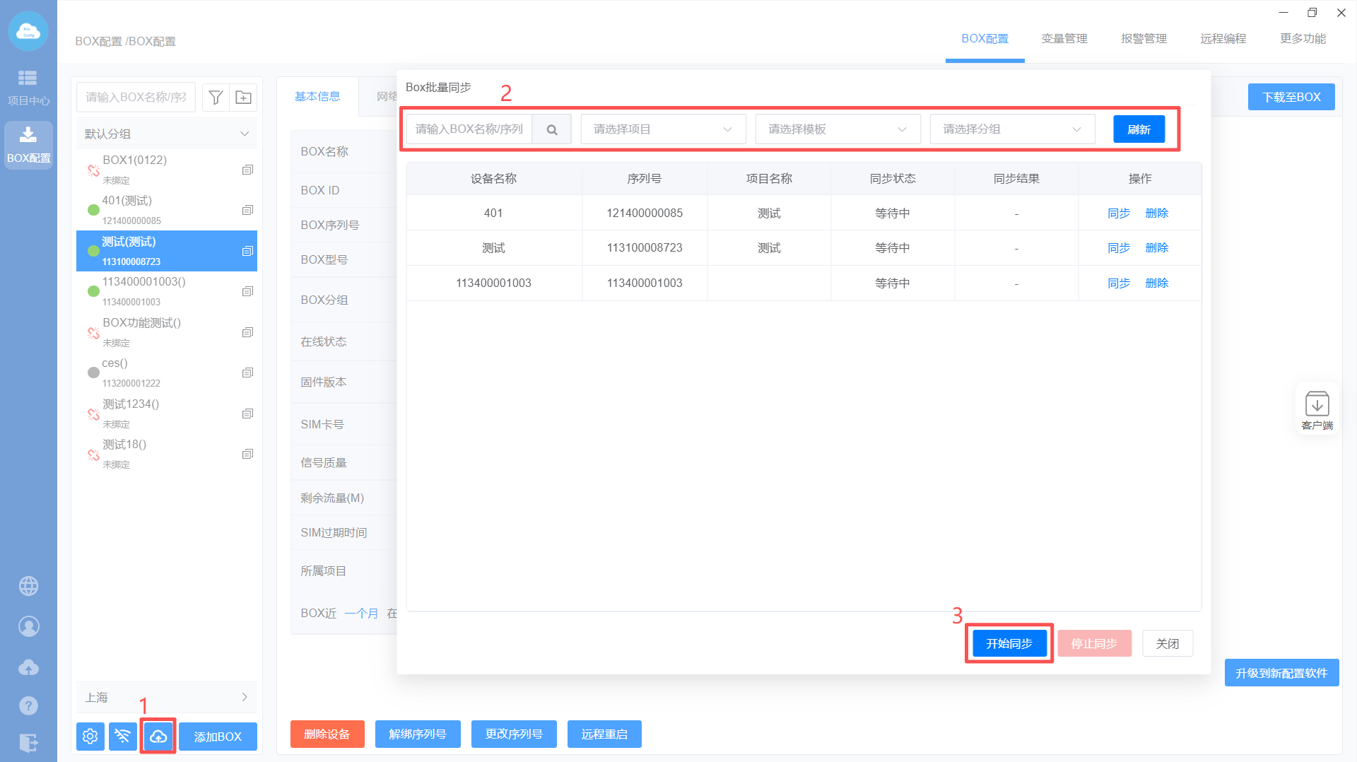 当多个盒子配置后未下载至BOX,可使用【BOX批量同步】一键同步,也可根据自己需要筛选同步;