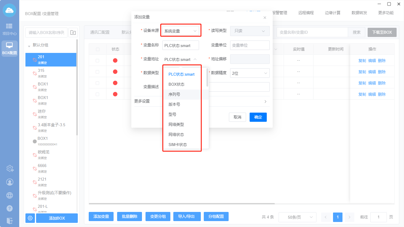 设备来源:设置变量的来源设备,分为添加的PLC设备/系统变量/自定义变量;