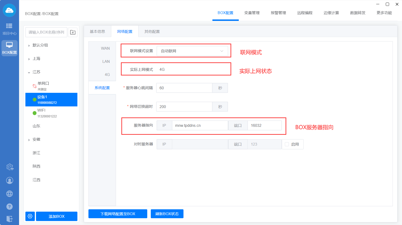可以查看BOX上线后的联网模式、实际上网方式以及可以查看修改BOX的服务指向等操作。