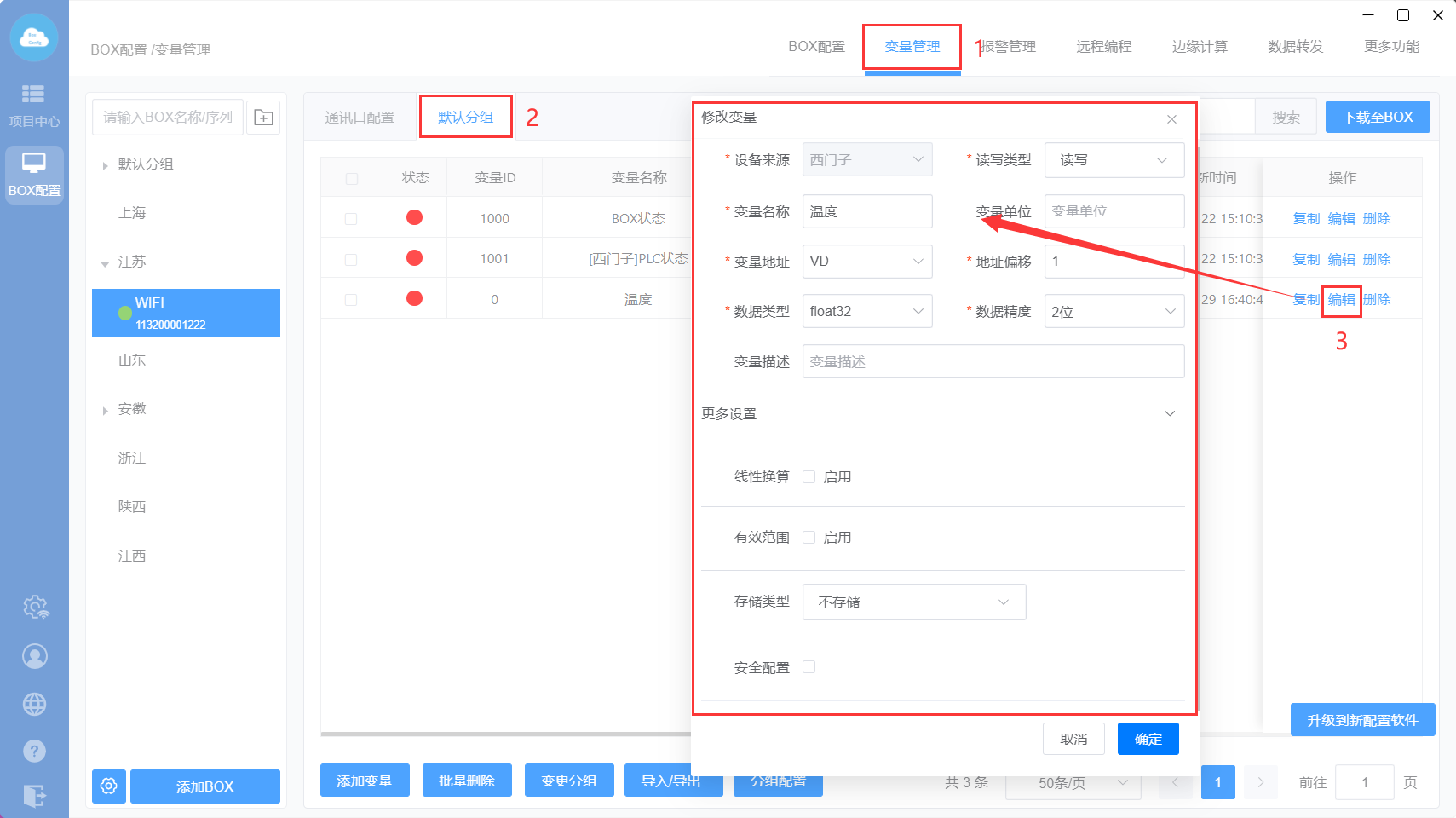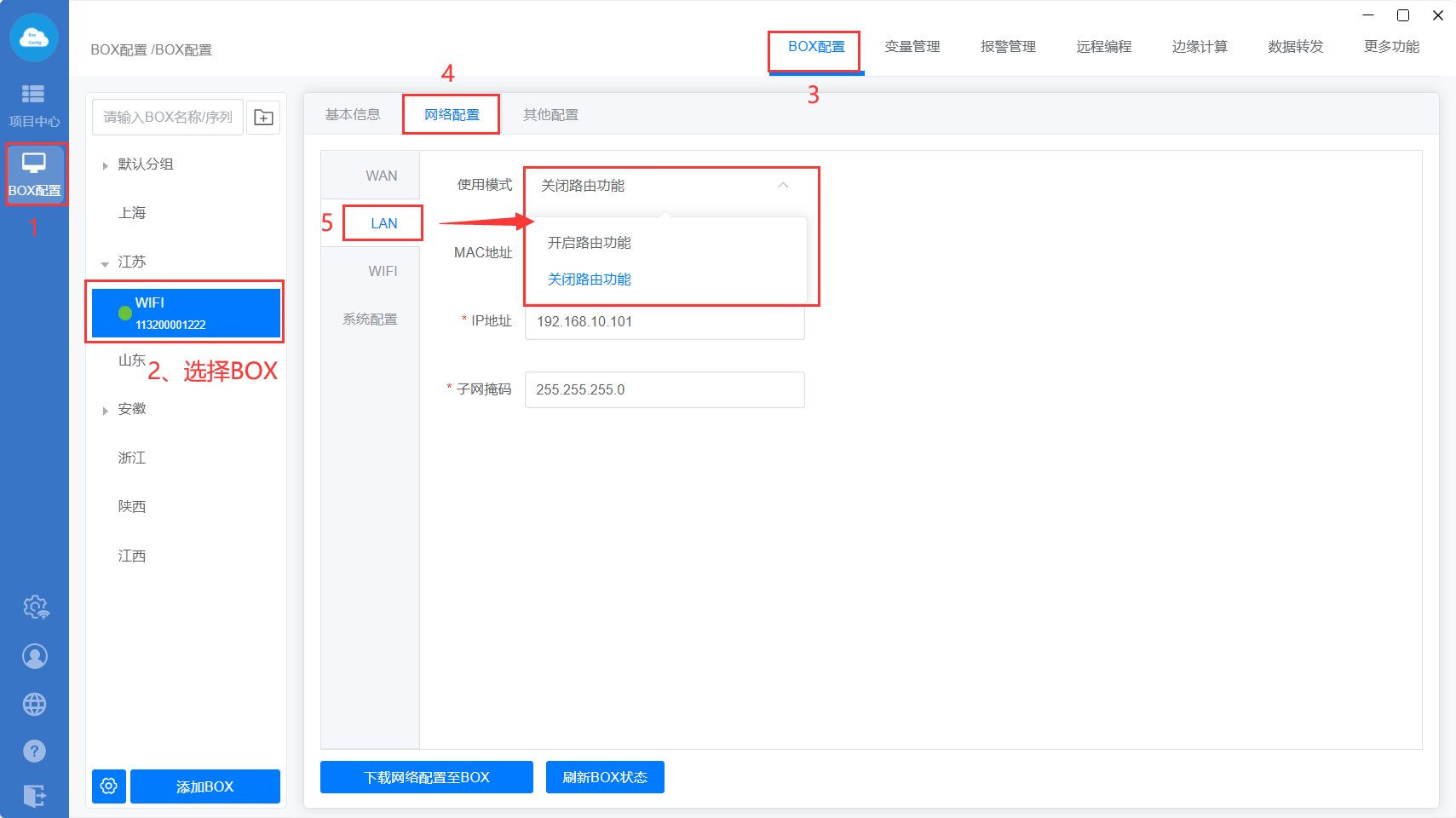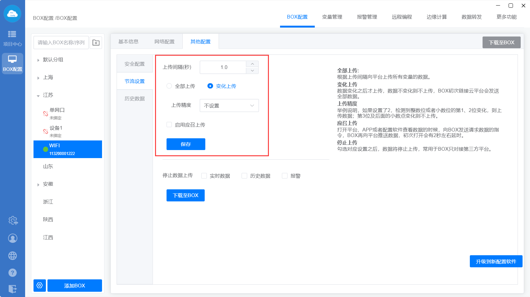 下载至BOX:把点表配置、更多功能、数据转发、边缘计算等设置直接同步到网关里面;