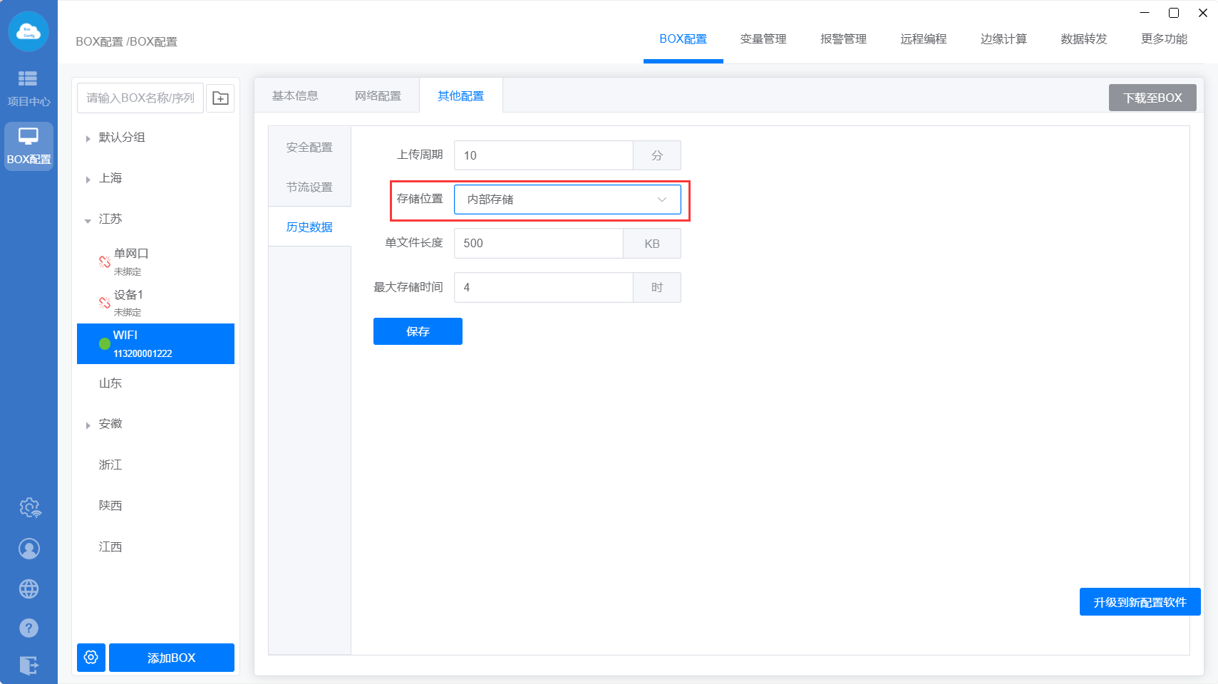 最大存储时间:BOX断网后缓存历史数据的时间,到达最大存储时间后,将不再存储历史数据。内部存储建议不超过4小时,SD卡存储建议存储不超过2天。
