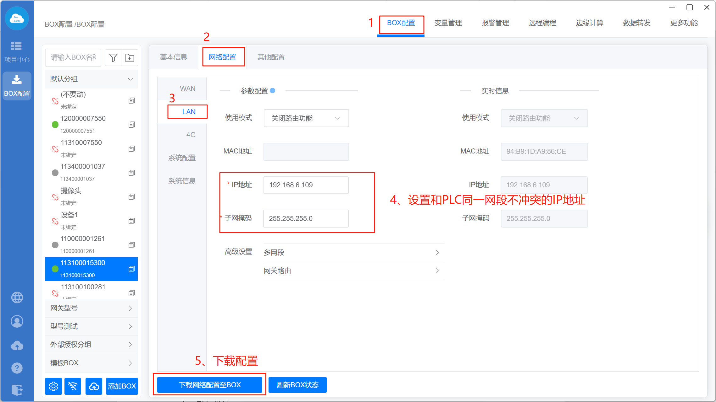 - Box配置(注意:修改box参数,与PLC保持在同一网段)
