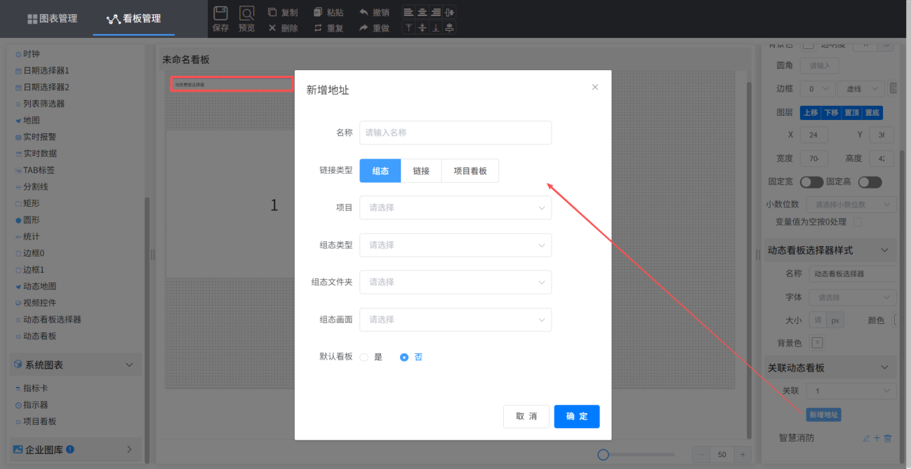 搭配动态看板使用,通过关联看板,新增看板内容,实现动态看板的切换。点击新增地址可以设置看板的内容。