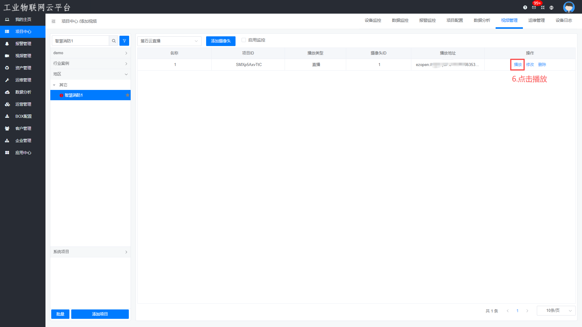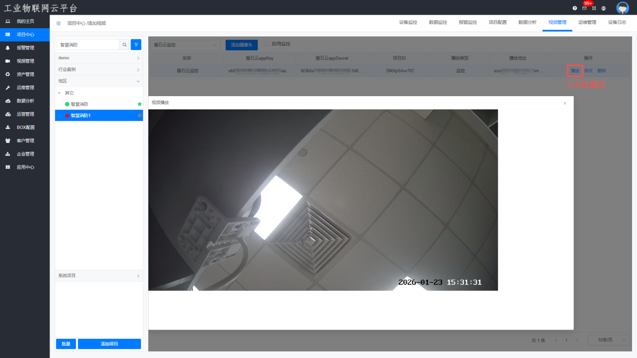 进入【项目中心】—>【视频管理】—>【添加视频】—>选择“萤石云监控”,点击“添加摄像头”,添加完成后点击“播放”查看摄像头画面