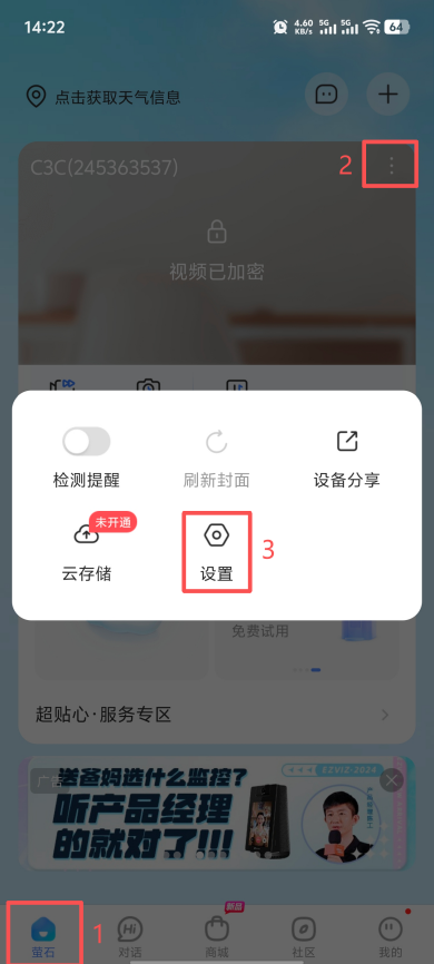 登录萤石云APP, 在设备上点击更多,开始如下操作