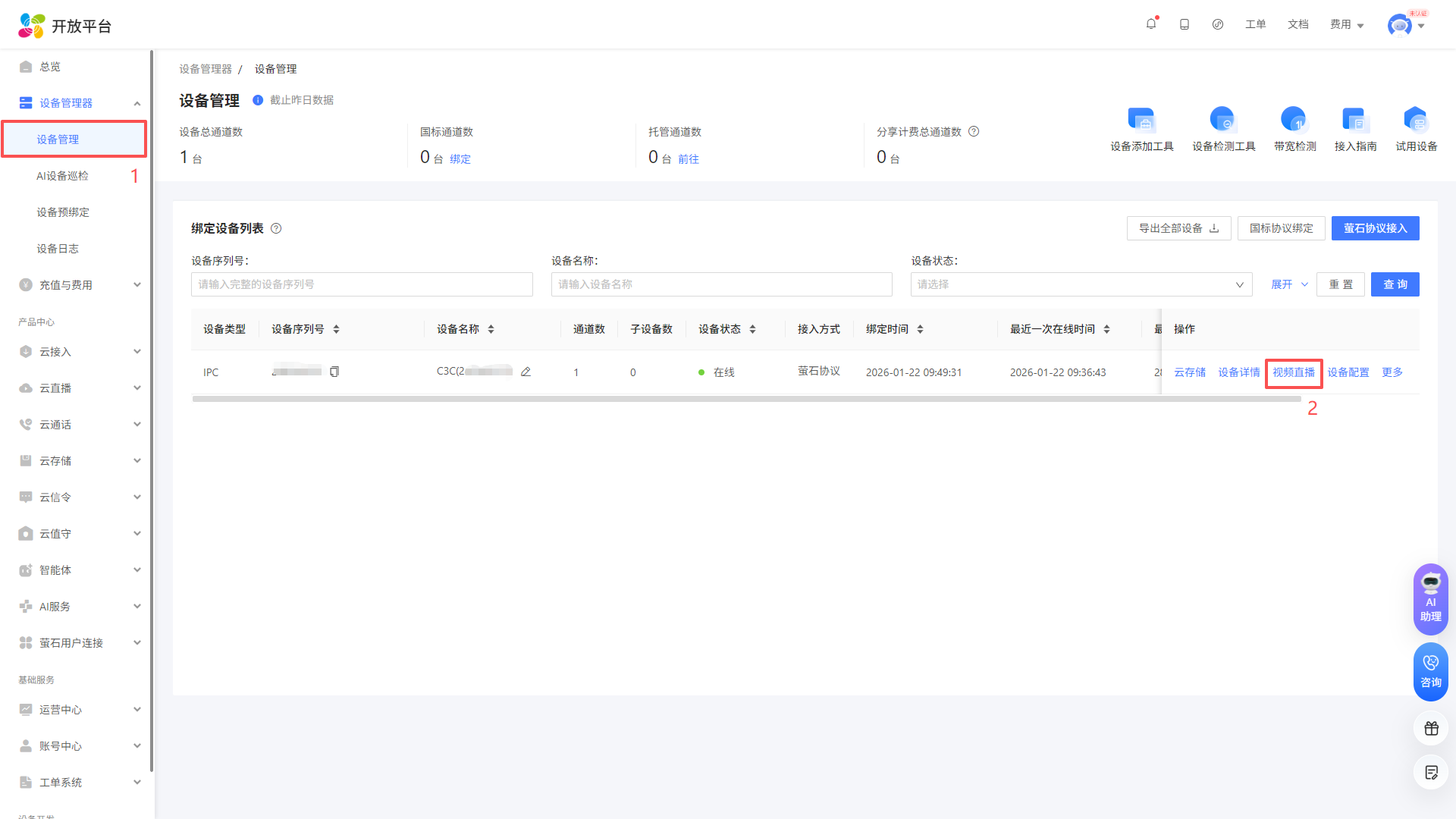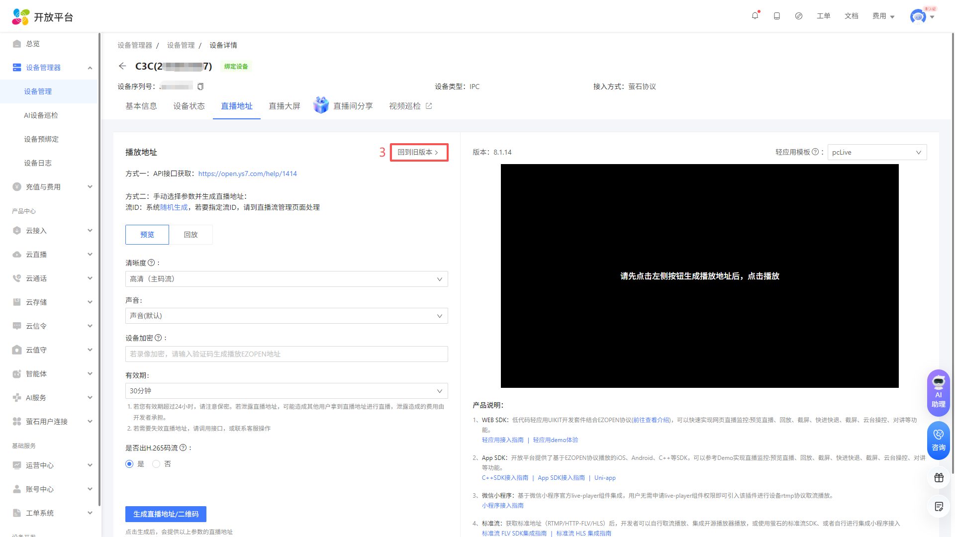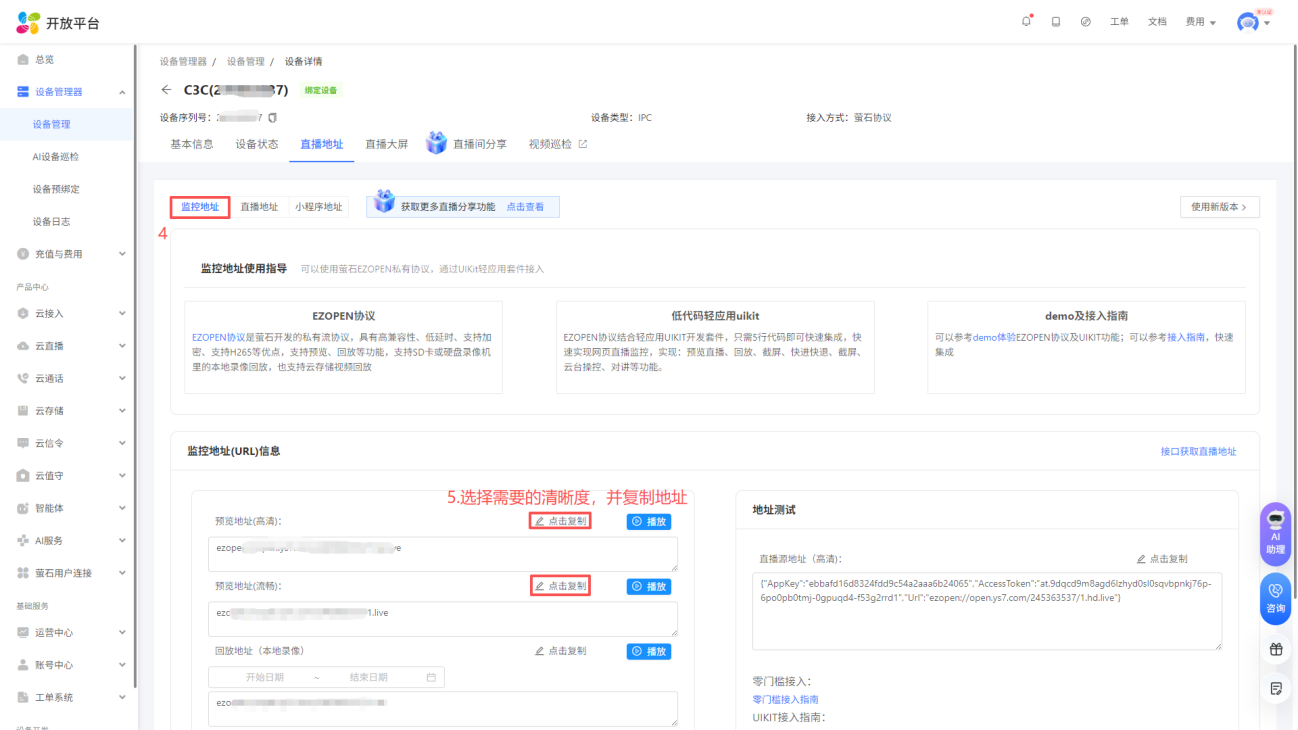 进入控制台页面后, 点击设备管理器-设备管理,选择您将使用的设备, 点击“视频直播”,选择EZOPEN格式地址,然后点击复制,在云平台填写(设备与萤石云之间的绑定请查看说明书或咨询客服)
