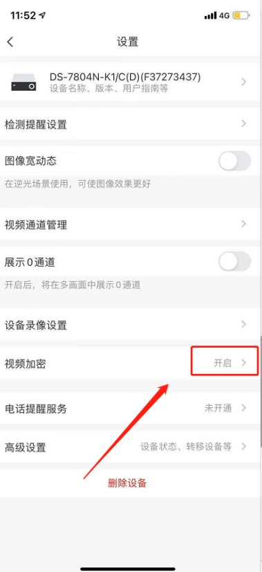 点击“萤石”,找到设备,然后点击...,跳转到设置界面,找到“视频加密”,点击后设置取消加密。